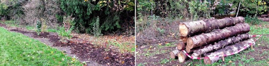 oben: Wir haben im Oktober 2025 am nördlichen Rand von Woldes Wiese bienenfreundliche Sträucher gepflanzt und ein Insektenhotel bzw. einen Unterschlupf angelegt.